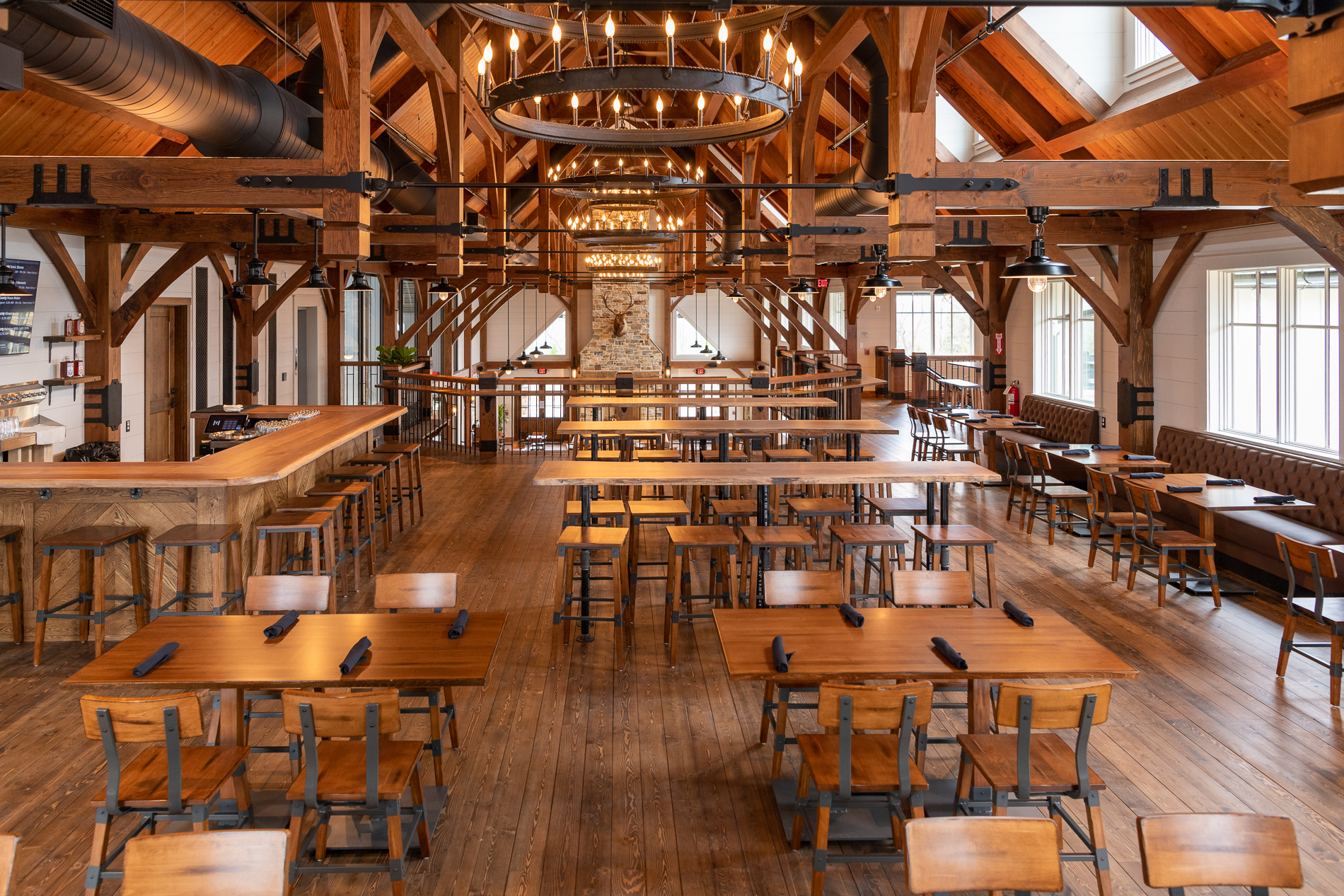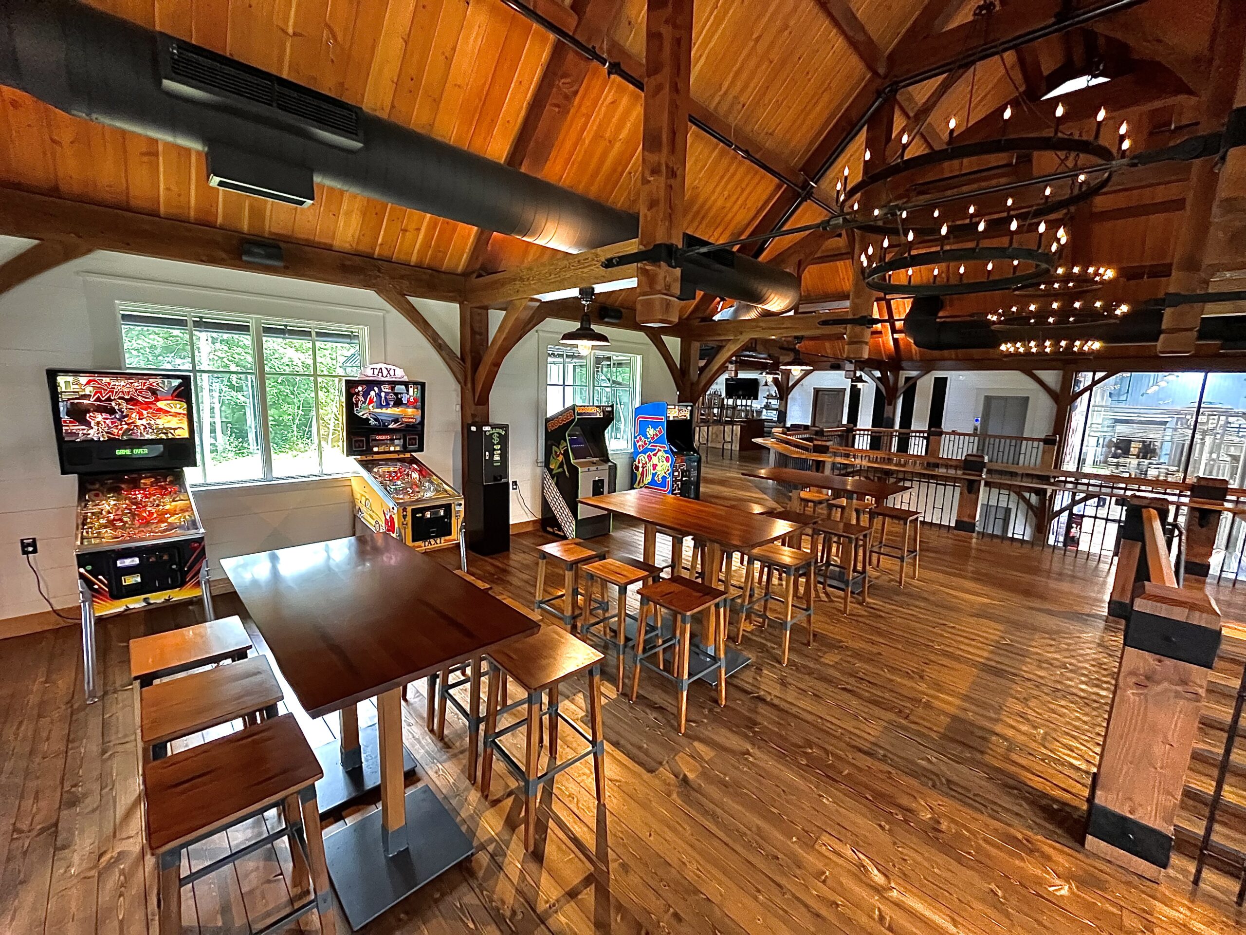 Our 1,900 square foot, private event room presents a beautiful scene with Douglas fir timber framing complimented by eastern white pine walls. The full custom oak bar creates a warm atmosphere for guests to enjoy our hand-crafted beer, cocktails, and local wines. This space includes a fully integrated sound system.