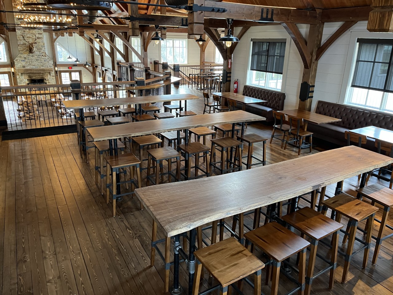 Our high-top tables offer a unique dining experience, seating thirty guests along beautiful natural wood slabs. We offer these high tops in two separate areas of our venue. You may choose to be located in our main dining hall or loft